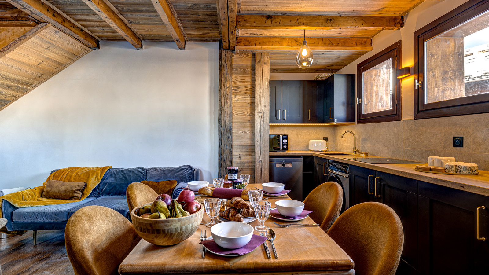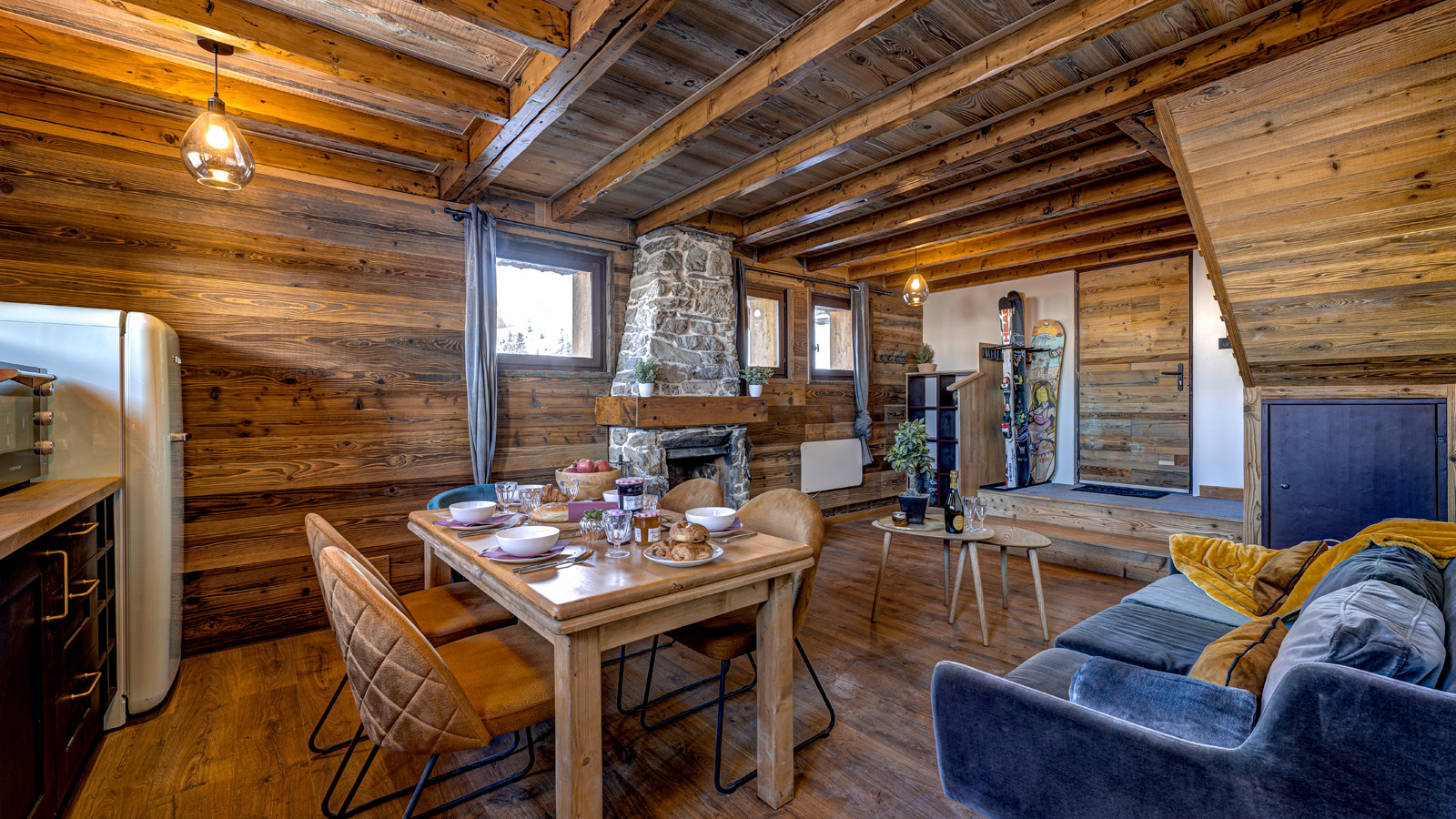 Cosy Spaces - The inviting living room, centred around a crackling fireplace, is perfect for relaxing evenings. The open kitchen makes family meals or raclette nights a pleasure, while the mezzanine bedroom adds a playful, welcoming touch for children.